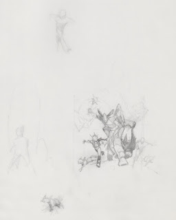 Pas mal de crayonnés, avec la particularité d'être tous issus de petits bouts de papier A4, sur certains vous avez les angles du papier qui donnent une idée de la taille de l'original